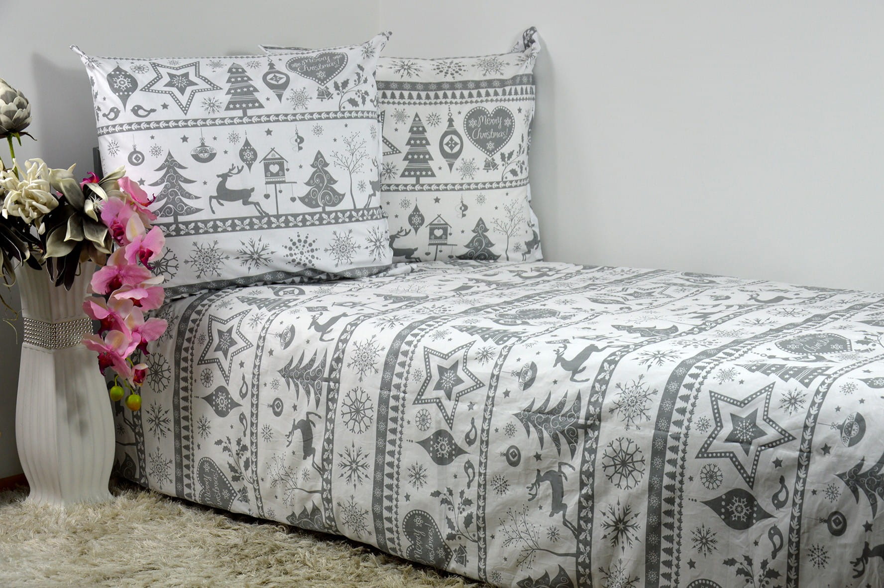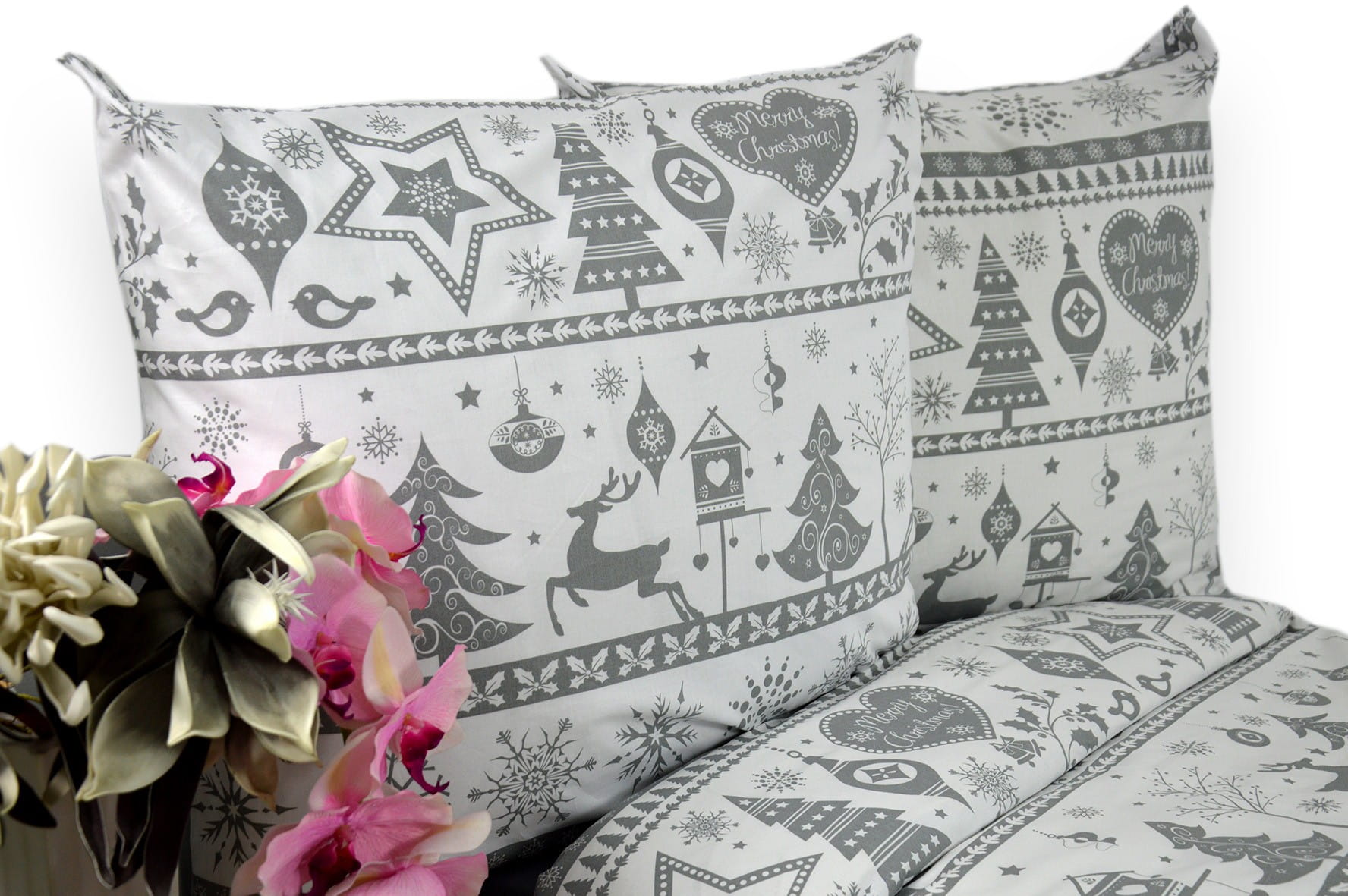 Pościel Bawełniana 140x200 świąteczna renifery szare pasy 1790w