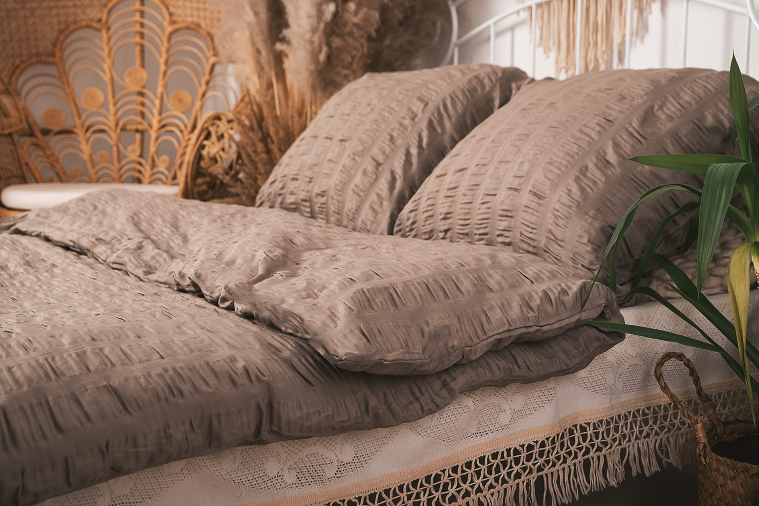 Pościel dzięki swojej strukturze zyskuje ciekawy, wyrazisty charakter, jest to idealny dodatek do sypialni, w której chcemy przełamać surowy i nowoczesny klimat. Jej powierzchnia sprawia, że komplet staje się bardzo praktyczny w konserwacji, nie trzeba go prasować, ponad to materiał dobrze znosi częste pranie w temperaturze 40°C.