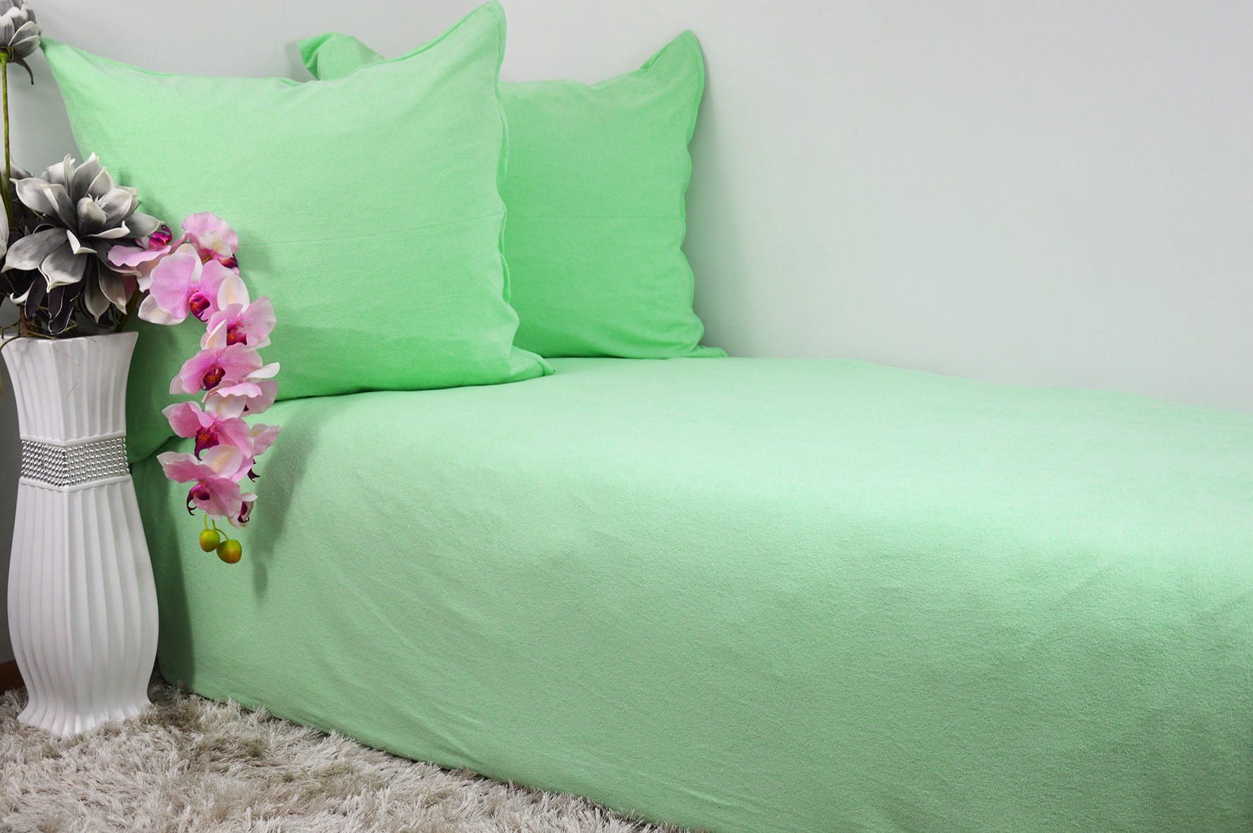 Komplet jednobarwnej pościeli frotte wykonany z bawełny. Frotte jest przyjazna dla skóry, świetnie przepuszcza powietrze podczas snu co przekłada się na zdrowie oraz komfort wypoczynku. Pościel jest miękka oraz puszysta, nie utraci swoich właściwości nawet po długim okresie użytkowania. Pościeli nie trzeba prasować co pozwala na zaoszczędzenie cennego czasu. Całość zapinana jest na praktyczny zamek błyskawiczny.