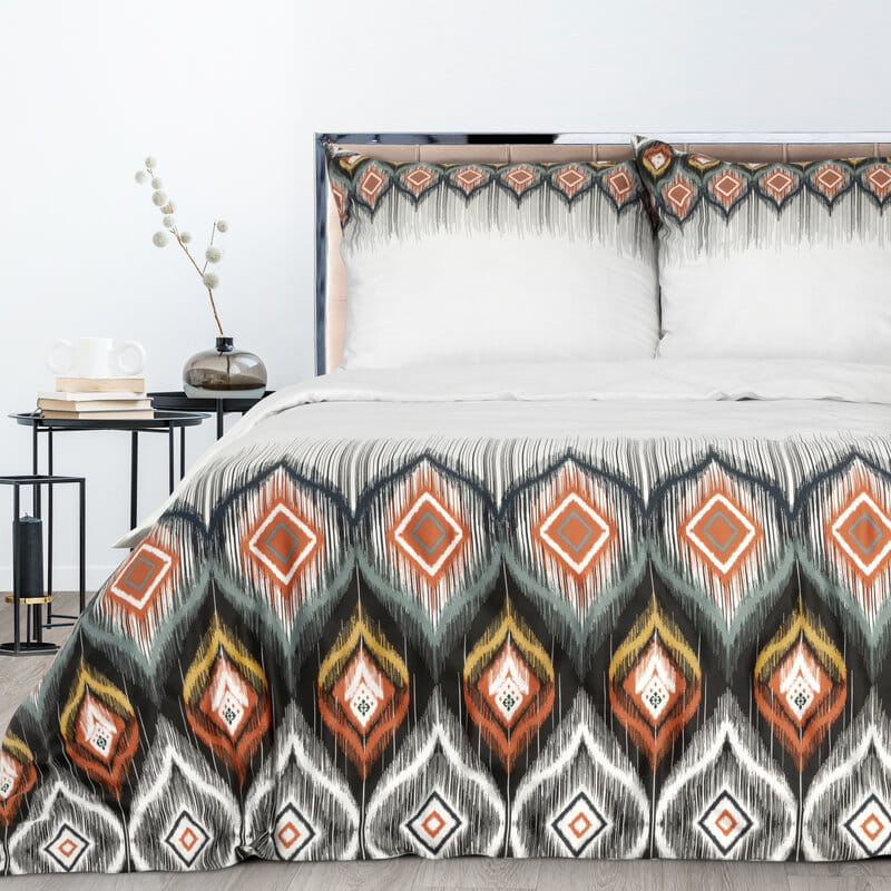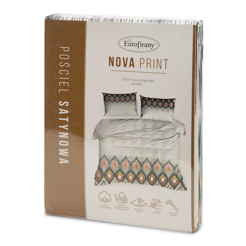Pościel satynowa wykonana z naturalnej bawełny. Komplet zapewnia komfortowy sen, gładka tkanina jest niezwykle delikatna dla naszej skóry, nie powoduje podrażnień oraz nie uczula. Satyna jest elegancka, materiał posiada połysk, który uwydatnia barwy oraz wzór pościeli. Komplet zdobiony został modnym wzorem w indiańskim klimacie, biała barwa w połączeniu z znacznie ciemniejszymi odcieniami, tworzy mocną i wyrazistą całość. Nadruk wykonany został z należytą starannością, jest trwały i wyraźny, pozostanie w świetnym stanie nawet po długim czasie użytkowania. Całość posiada zapięcie w postaci zamka błyskawicznego, ułatwia on wymianę poszewek na inne. Tkanina posiada certyfikat Oeko-Tex. Zobacz pozostałe komplety z kolekcji Nika.